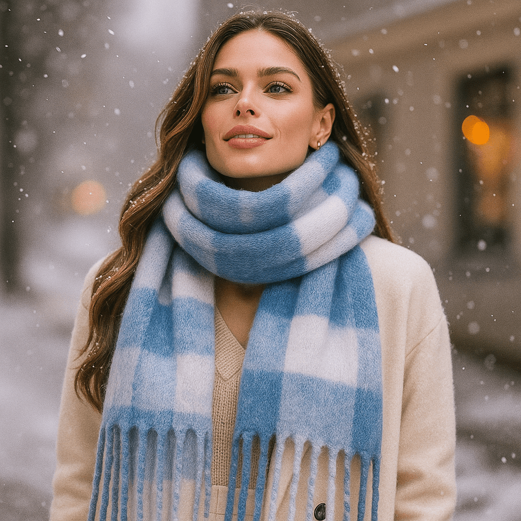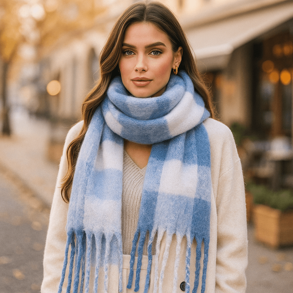 De herfstscène komt tot leven met deze sjaal die knuffelt met volume en lichtheid. De pluizige textuur en het brede ruitpatroon roepen een gevoel van onmiddellijke rust op, als een troostende pauze midden op de dag.