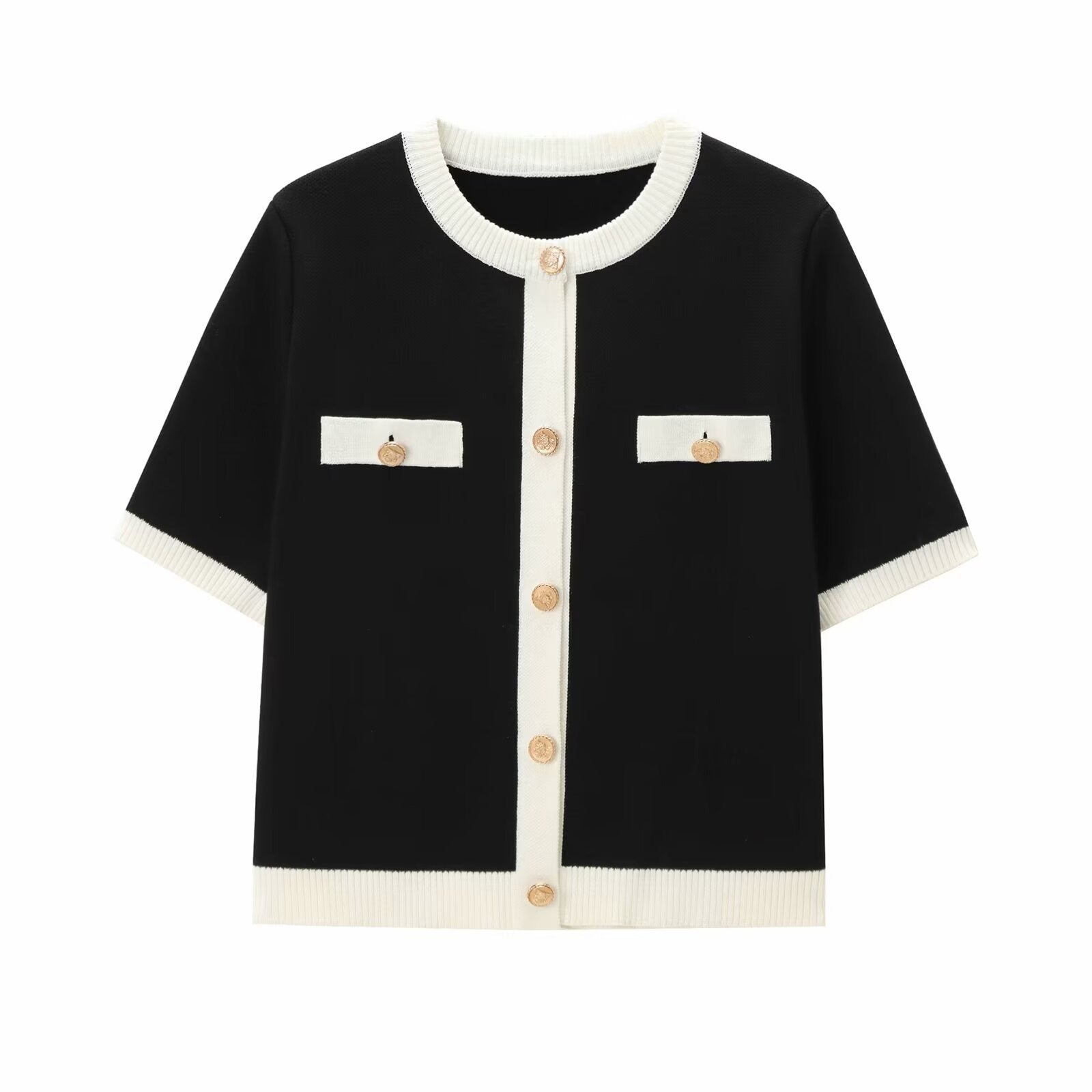 Ontdek een item dat klassieke charme combineert met een eigentijds silhouet. Dit kort gebreide vest heeft licht pofmouwen en een gestructureerd ontwerp, versterkt door een contrasterende zwarte bies bij de kraag, de sluiting aan de voorkant en de manchetten. Goudkleurige knopen en schijnzakken zorgen voor een verfijnde, evenwichtige look.