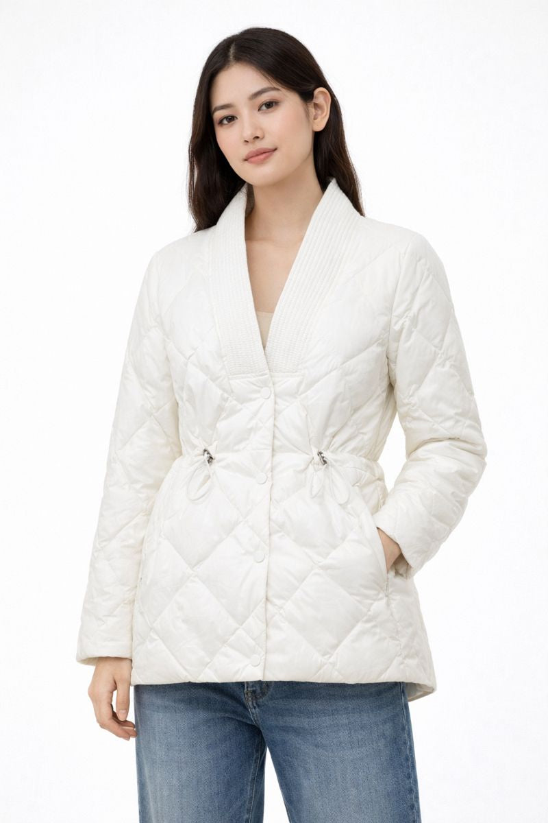Gewatteerd damesjack met lange mouwen en knoopsluiting aan de voorkant. Open V-hals en doorgestikt met ruitjes. Met verstelsysteem met trekkoord aan beide kanten van de taille om de wijdte aan te passen.