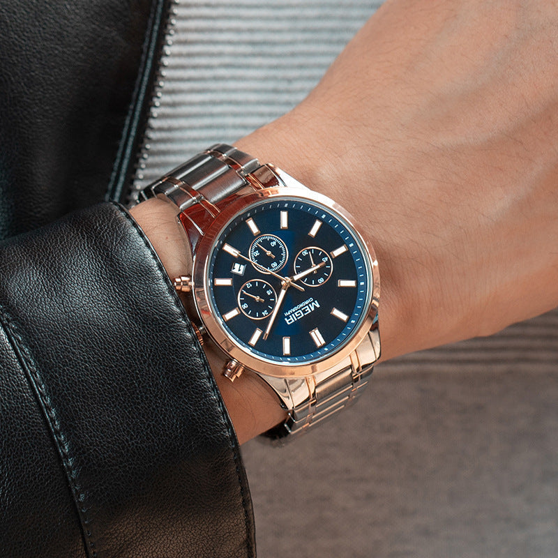 Dit horloge heeft een stalen kast met uitgebalanceerde proporties en een wijzerplaat georganiseerd in zichtbare cirkelvormige registers. De lay-out aan de voorkant concentreert de aflezing in het midden, met duidelijk afgetekende uurmarkeringen en contrasterende wijzers die het geheel structureren. De metalen armband volgt de lijn van de kast en versterkt zo een doorlopende en coherente constructie.