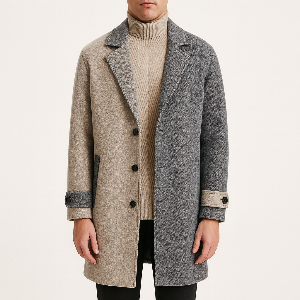 Het is gemaakt van een zachte en duurzame wolmix en heeft een tweekleurige afwerking voor contrast en visueel karakter. De brede revers en knopen aan de voorkant versterken de klassieke uitstraling, terwijl de manchetten met lusjes een vleugje modern kleermakerswerk toevoegen.