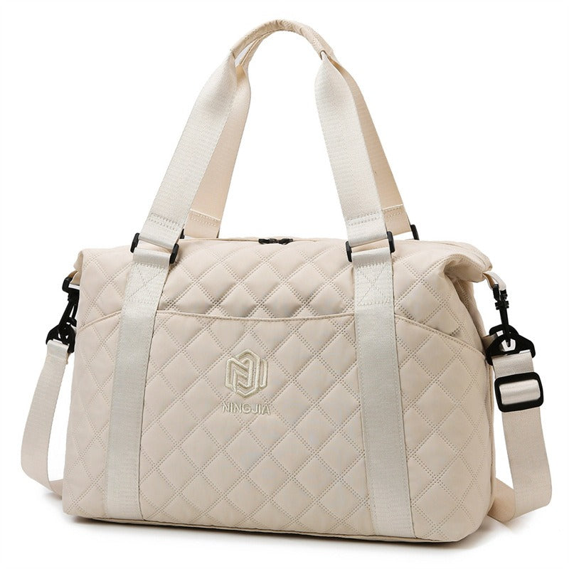 De gewatteerde structuur met ruitpatroon voegt een stijlvolle touch toe en beschermt je spullen. De tas is gemaakt van lichtgewicht, duurzaam materiaal en heeft meerdere buitenvakken, ideaal om essentiële spullen zoals flessen, gadgets en accessoires binnen handbereik te houden.